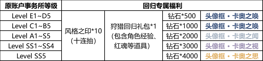 2. 回归福利:在老用户专属回归区服“红墓市”中,将根据旧版本原账户事务所等级发放对应的钻石、限定头像框。