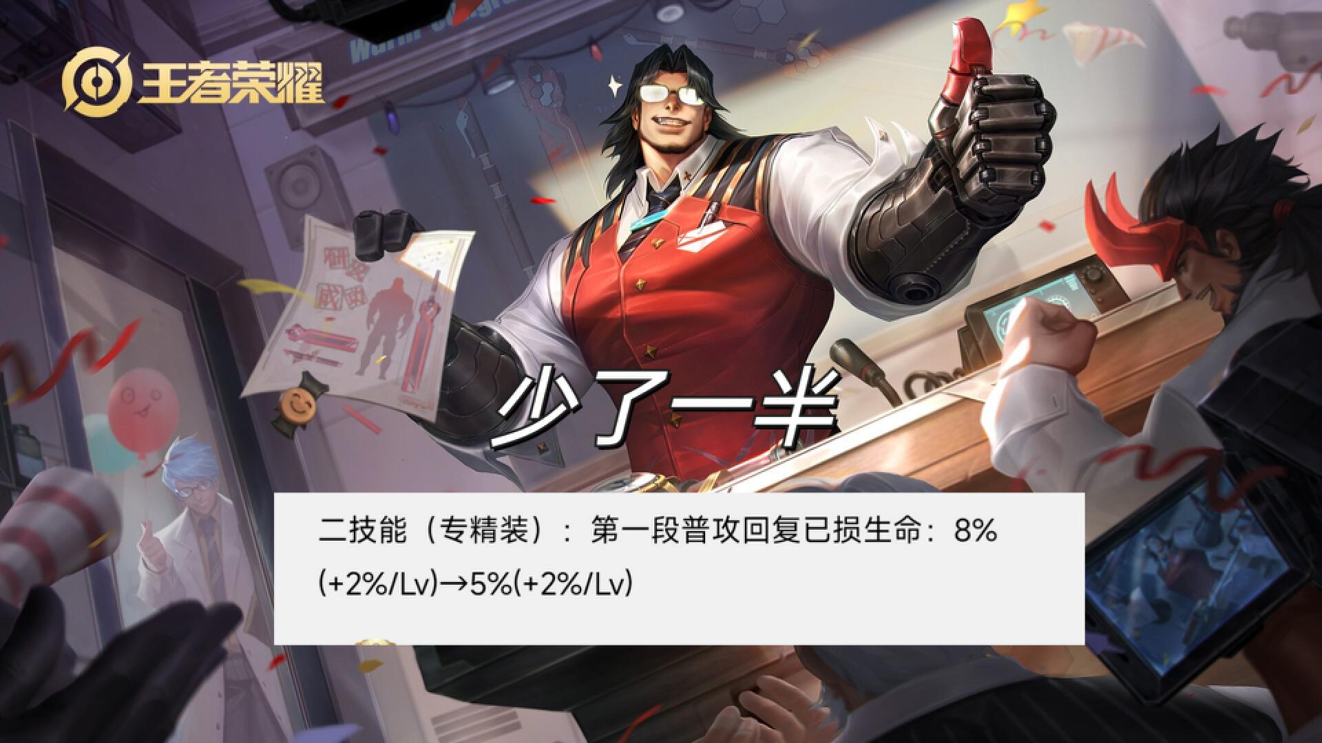 因为过于强势,所以官方从10%的基础已损生命值回复量调整为8%,而本次体验服中再次降低了基础已损生命值回复,从8%下调至5%,技能每升一级保持不变,还是增加2%。