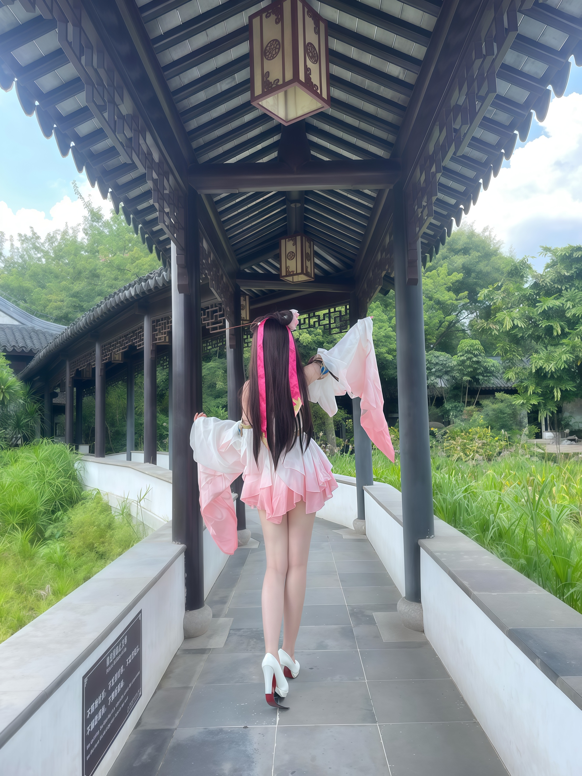 在第2张照片中,小姐姐站在了一个走廊里面,可以看得出来这周围的建设都是一些古式建筑,很搭配貂蝉的这款服装。