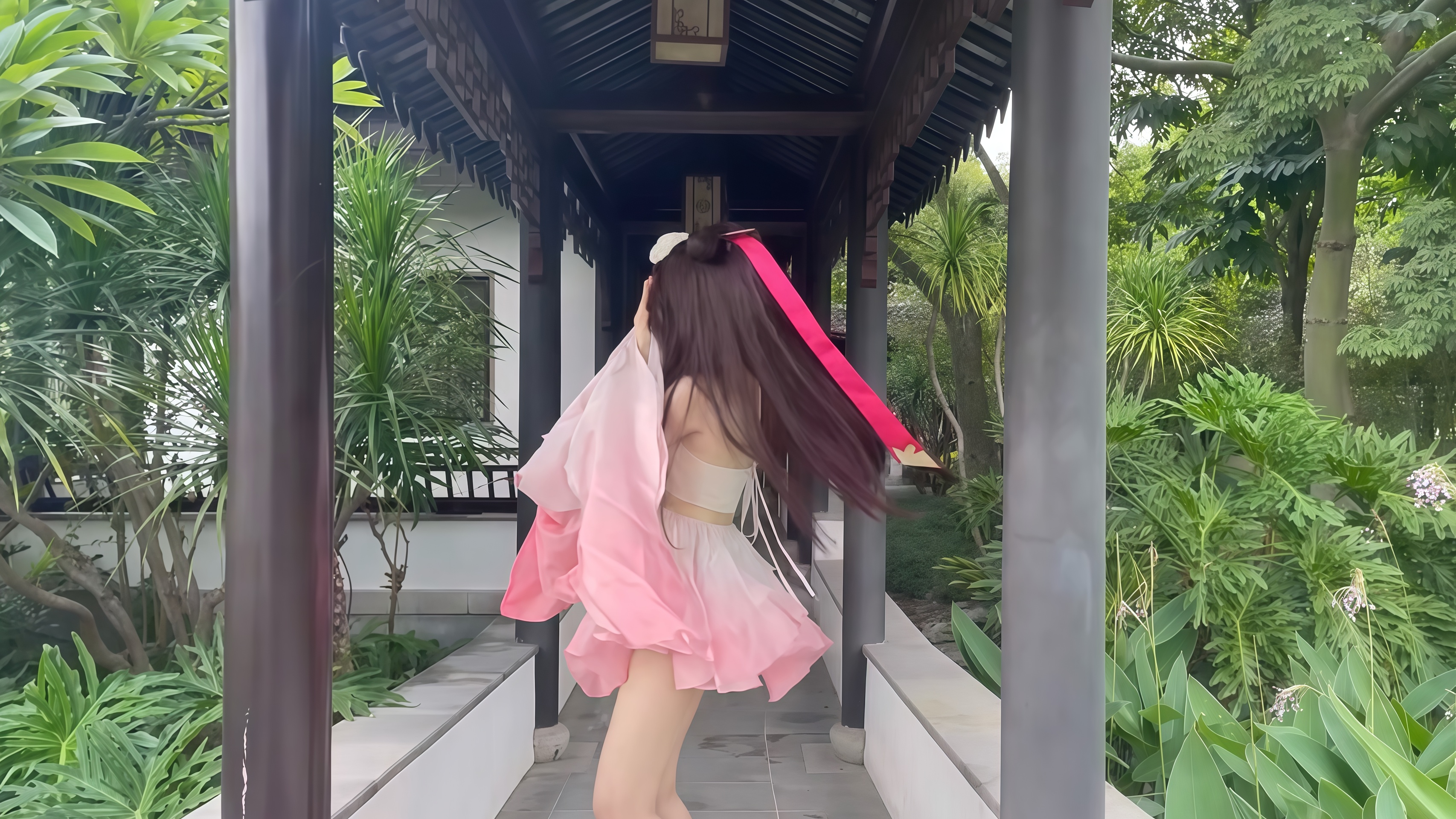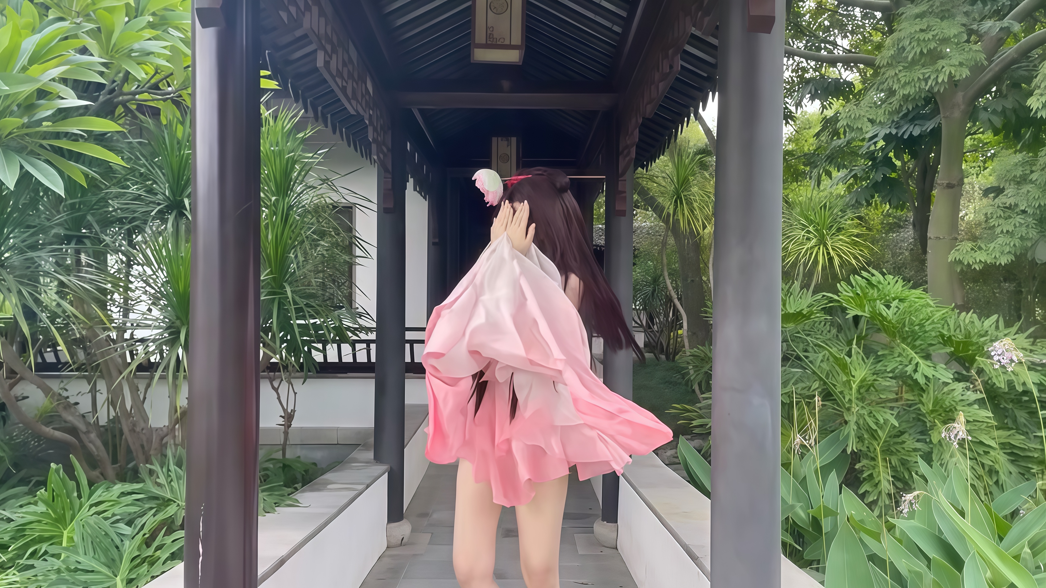 然后再来看一下第3张照片,小姐姐依旧在这个走廊里面,可以看到这走廊两边就是花草树木,不得不说这个画面还是非常不错的。