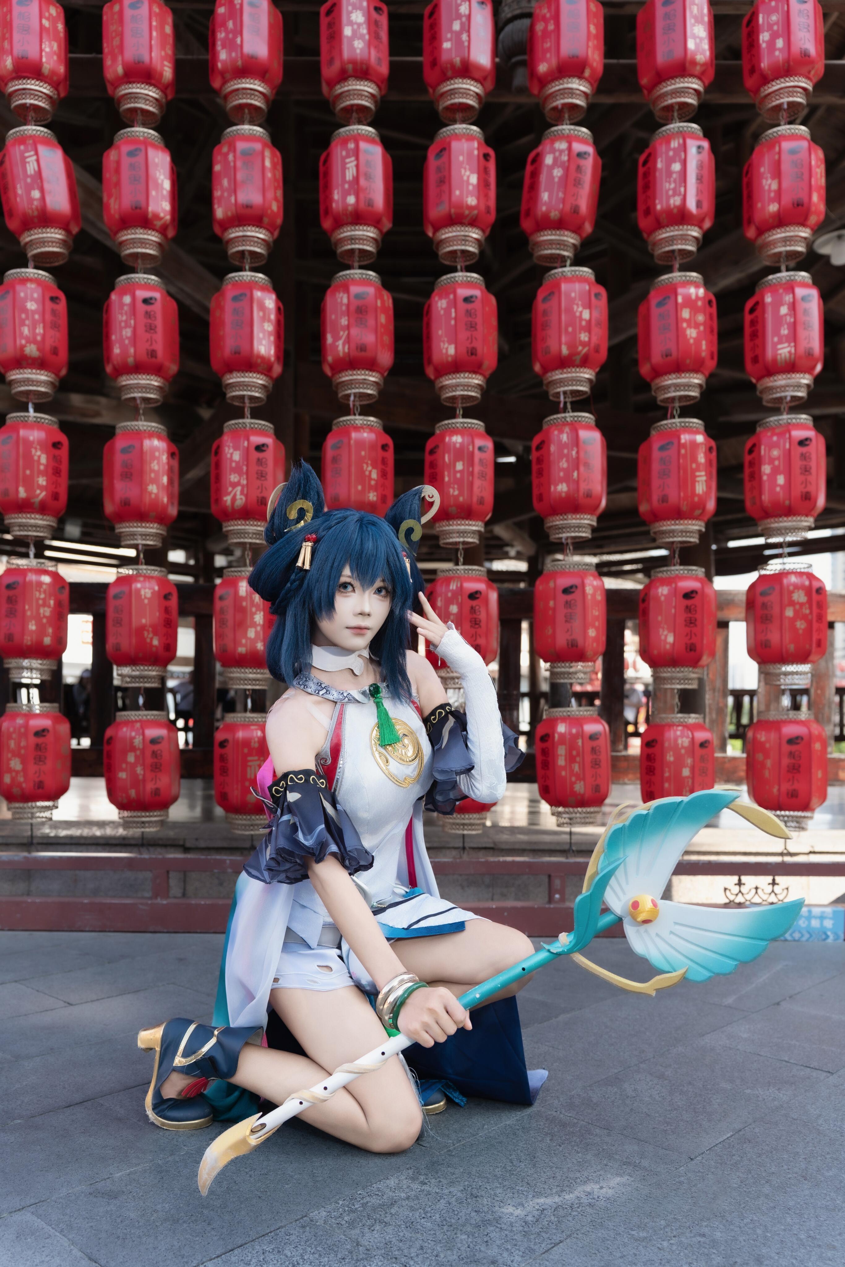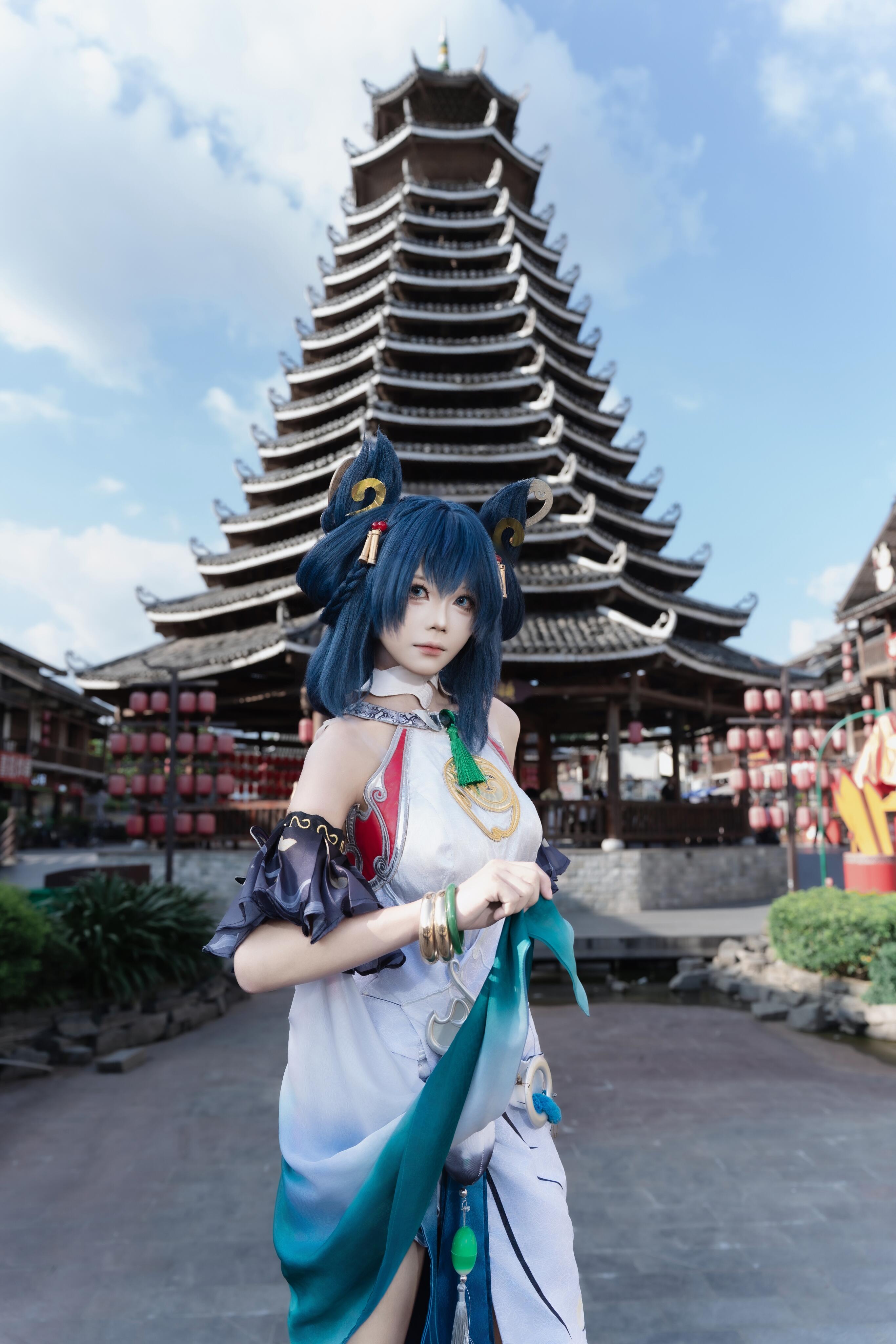 第4张照片和第3张照片一样在同一个地方,但这一次拍了小姐姐上半身的部分,并且拉近的镜头可以看到整体的妆容服装发型还是非常精致的,很还原。