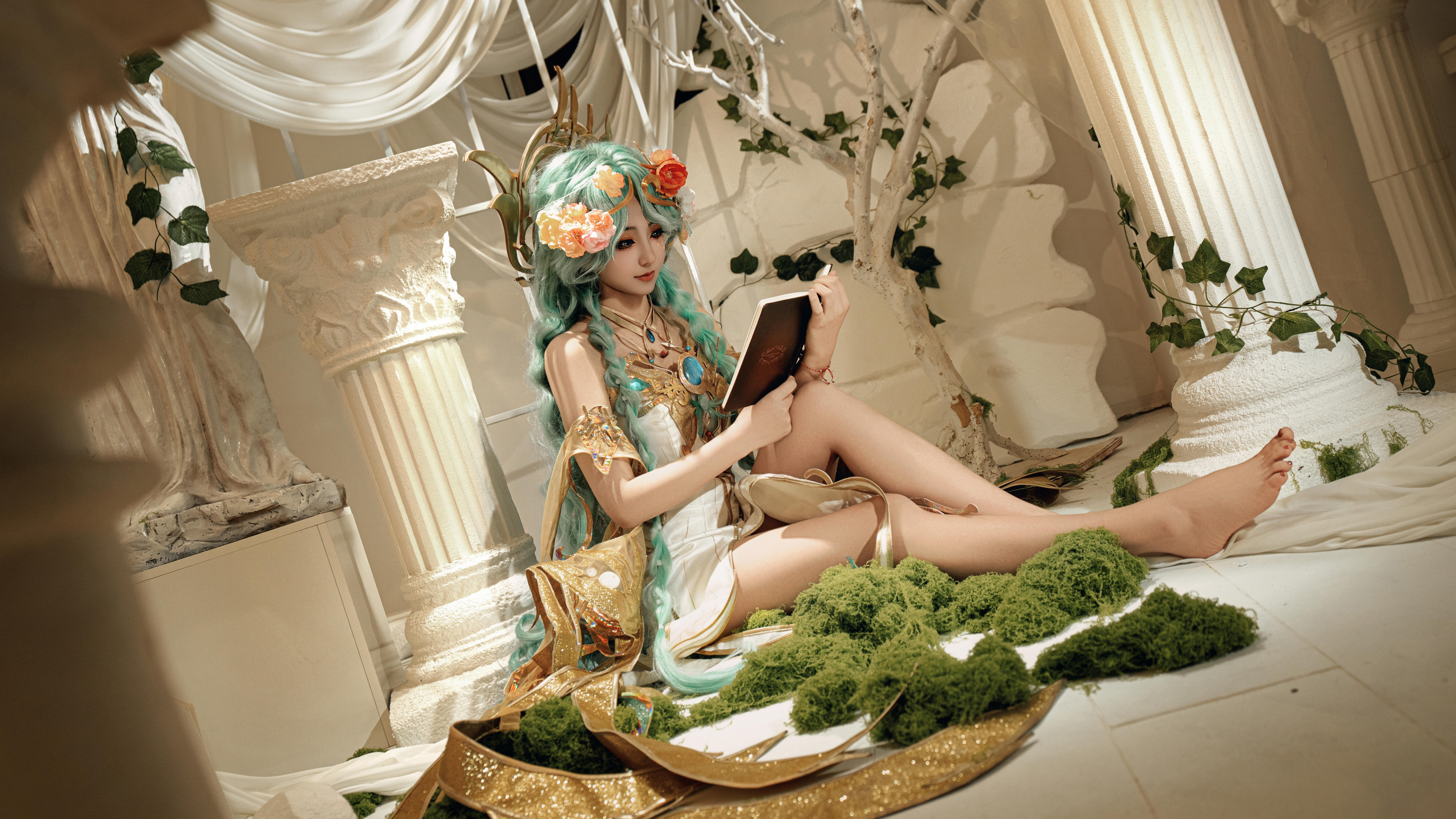 在第二张照片中,小姐姐的表现比较日常,这一次她坐在一个很好看的背景中,她手持一本书,正在欣赏里面的内容,服装的设定和周围的场景确实非常搭配,很梦幻。