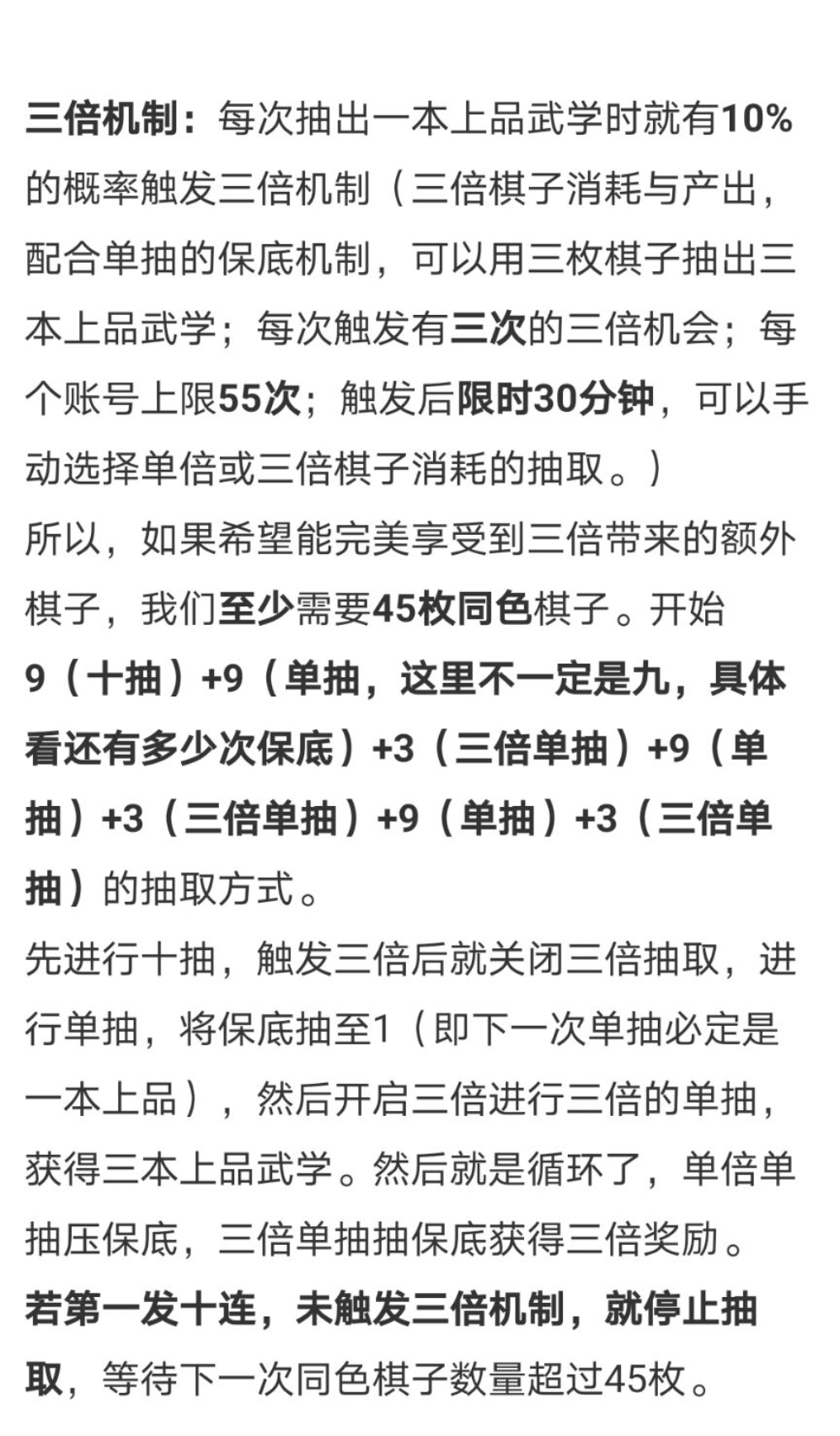 初入游戏不建议进行黑棋抽奖,初期只选择白棋抽奖,保持耐心,二十级左右武学门派基本定型后再黑棋选择对应门派抽奖。个人感觉白棋抽奖会有一到两个侧重门派,每个人都不相同(无法验证),如果有,可以选择抽到武学较多的门派玩。