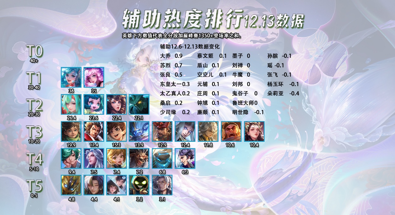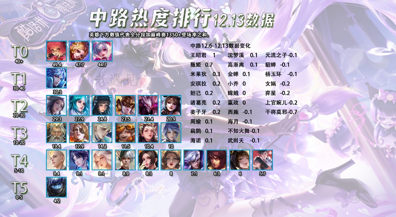 蚩奼属于本身强度就很高,再来一款新皮肤加点属性,直接给抬到T0或者是T0.5的强度了。在出场率这么高的情况下,全分段,巅峰赛1350+和顶端局的胜率都超过了50%,这个数据已经非常不错了。