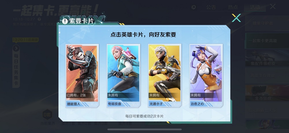 除了每天刷新的每日任务,玩家还可以通过索要获得伙伴共享的卡片。