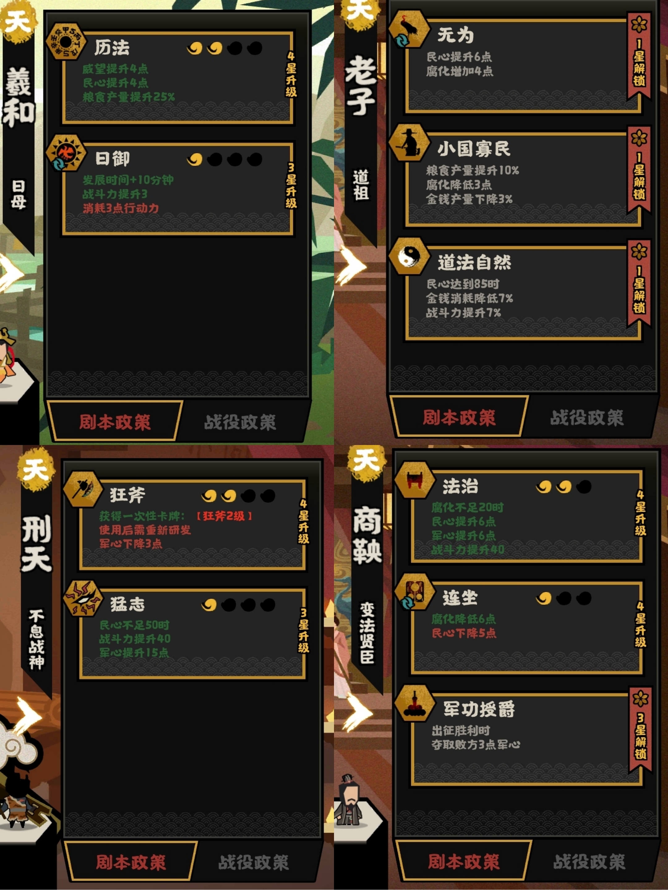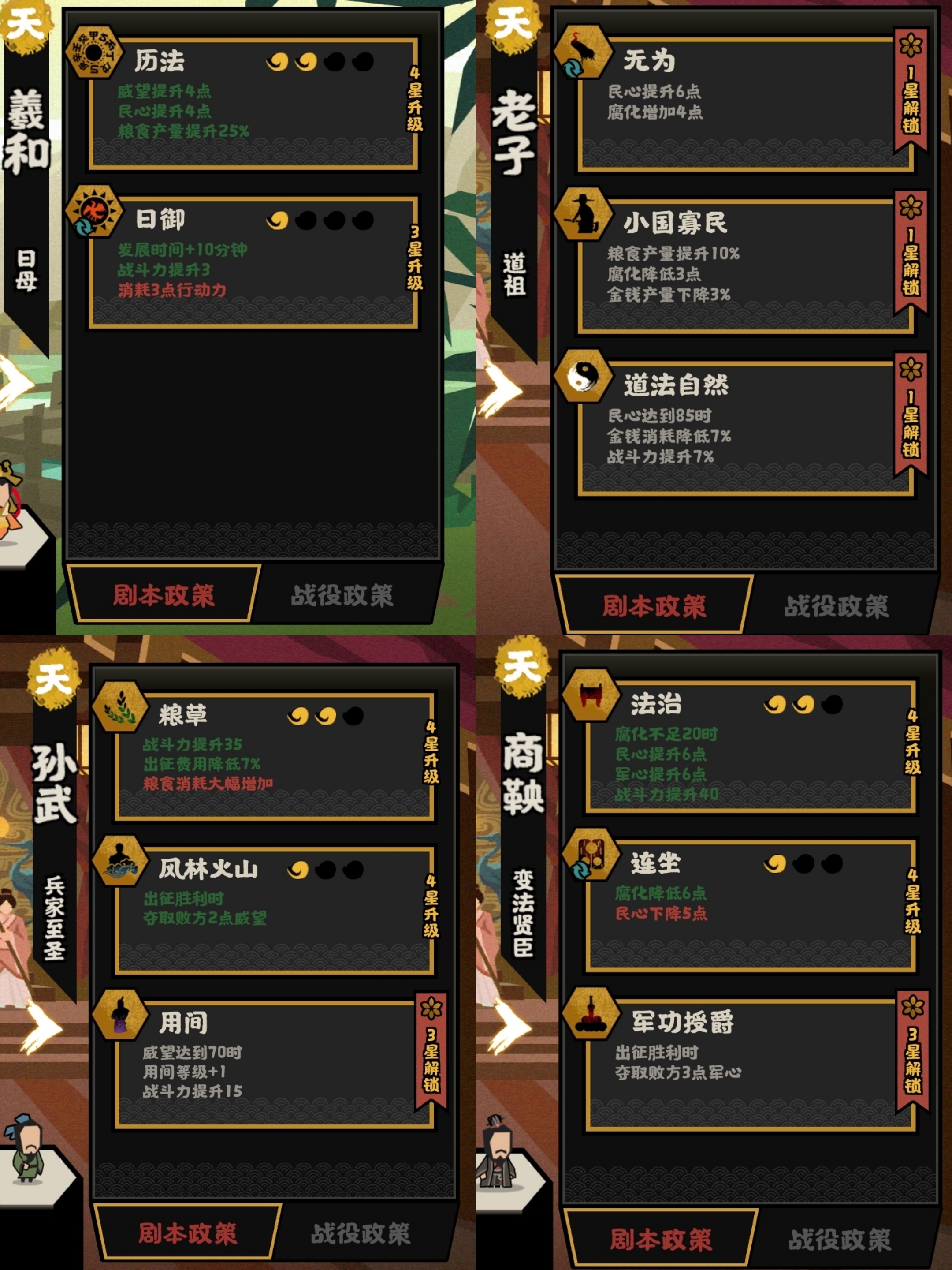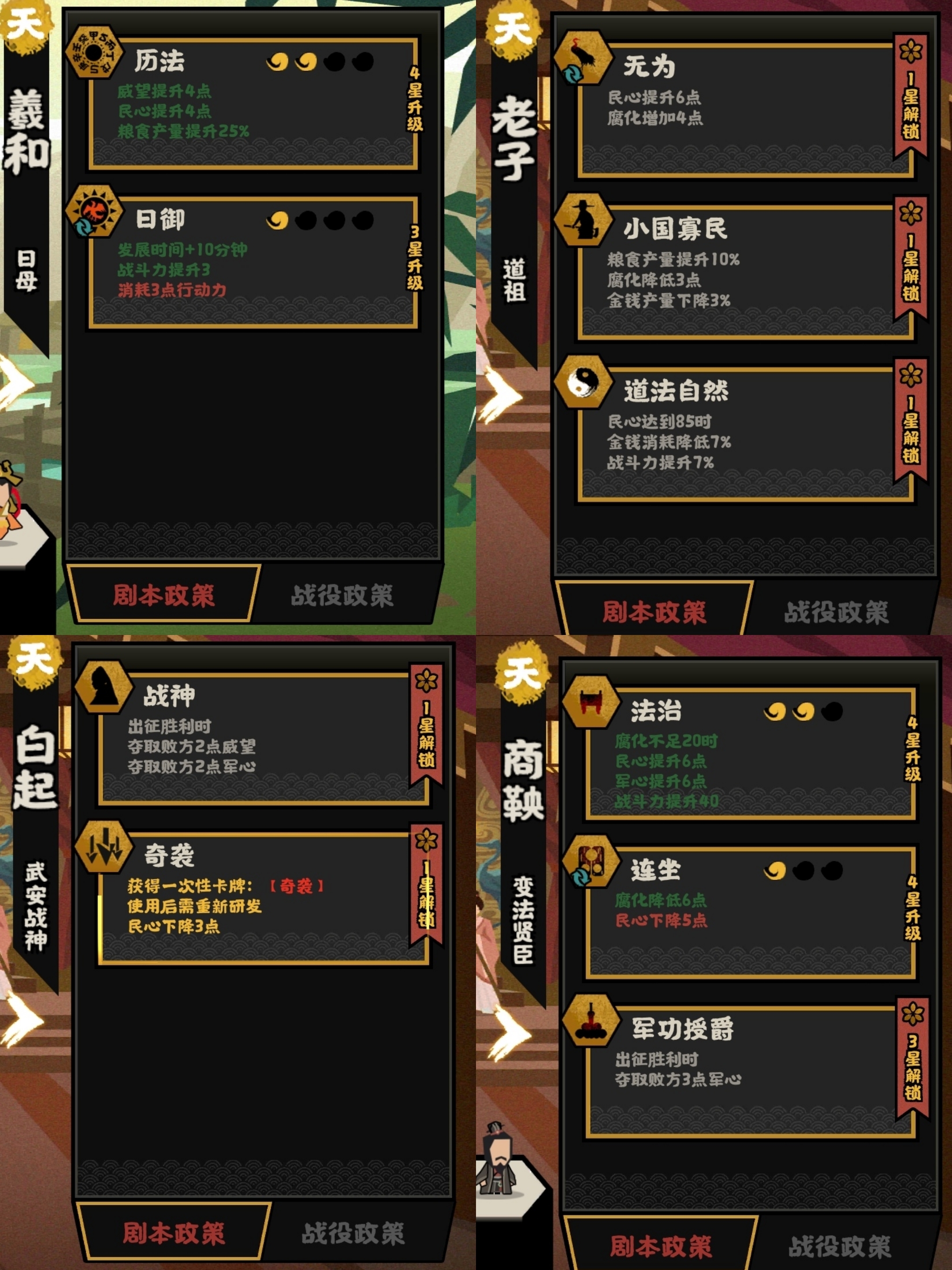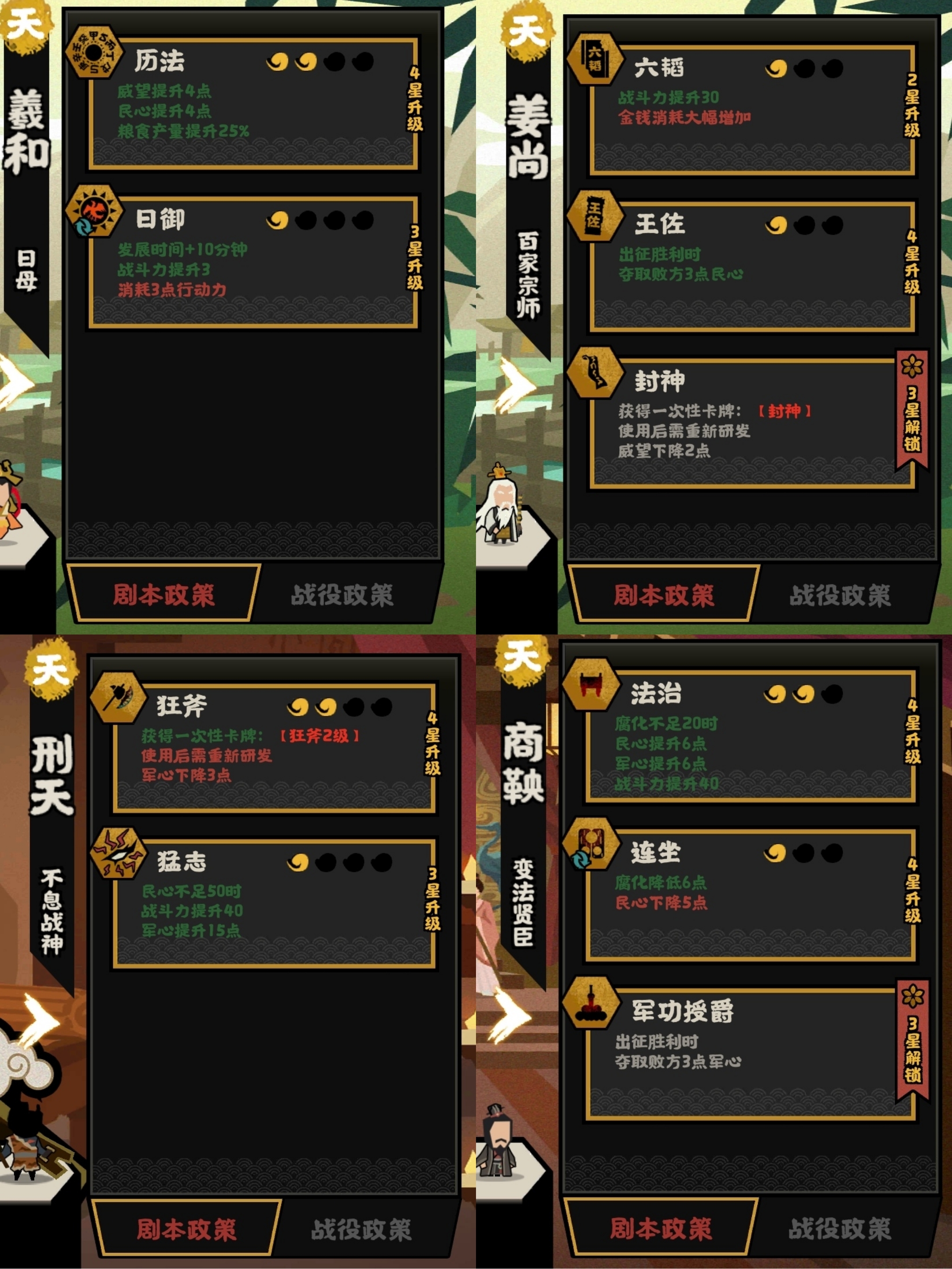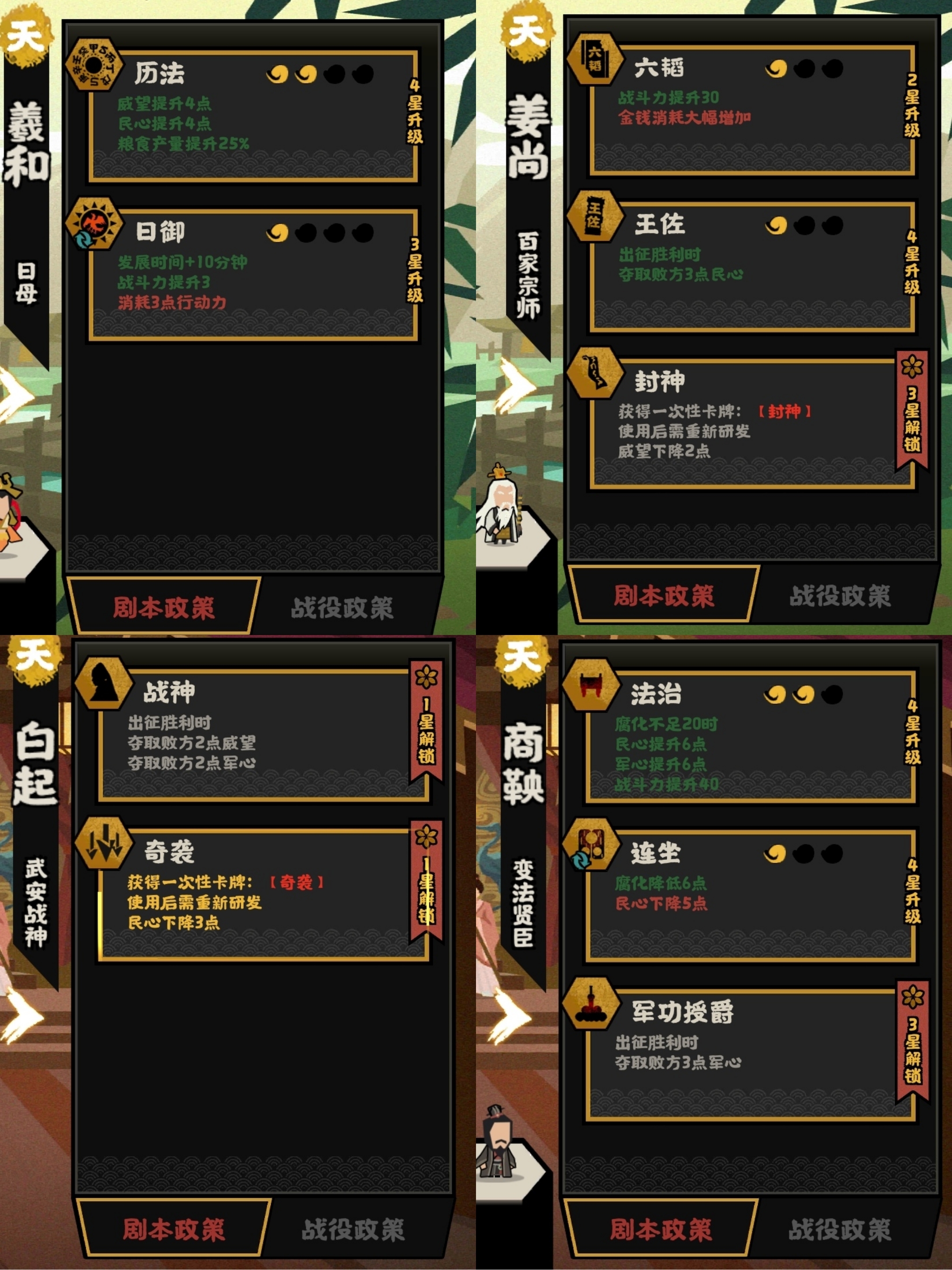 优点:能兼顾民心,军心状态;资源量适中;攻击力加成很高。有攻击卡牌。