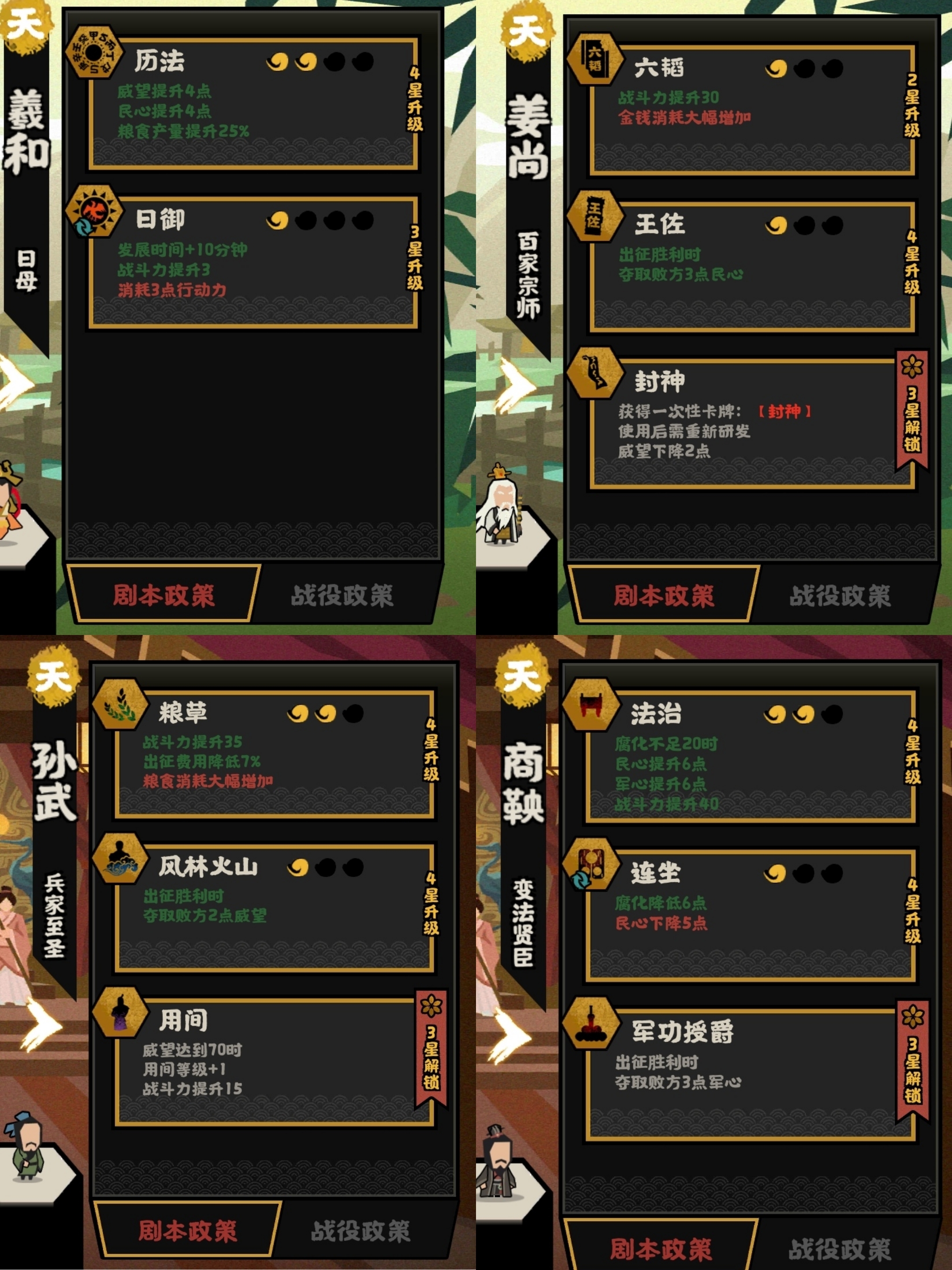 缺点:资源加成太少,姜尚几乎不加资源还耗资源;威望无法兼顾,只能选择必要时再用姜尚封神技能。